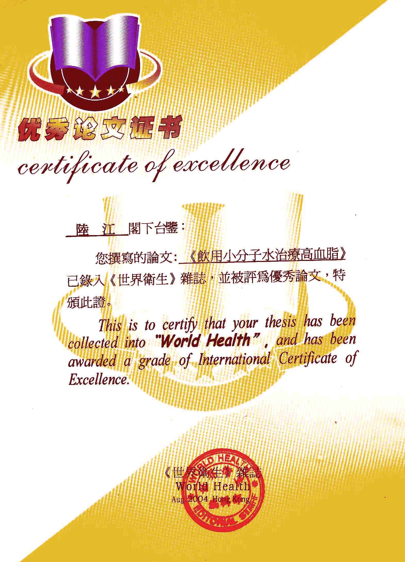 《飲用小分子水治療高血脂》獲優秀論文獎